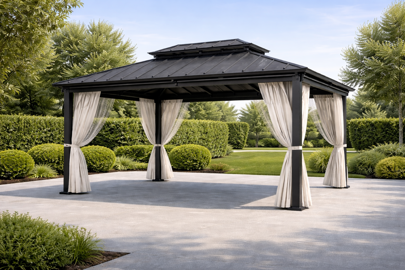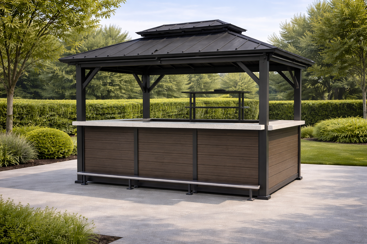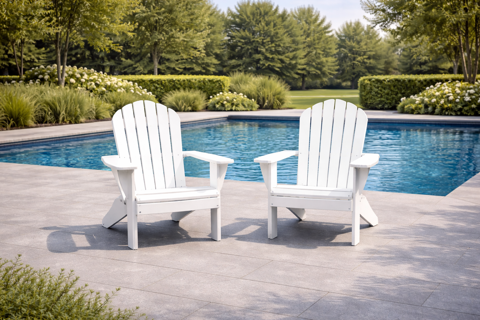 Siège incliné avec dossier large et accoudoirs, conçu pour une utilisation dans des espaces extérieurs tels que jardins ou terrasses.