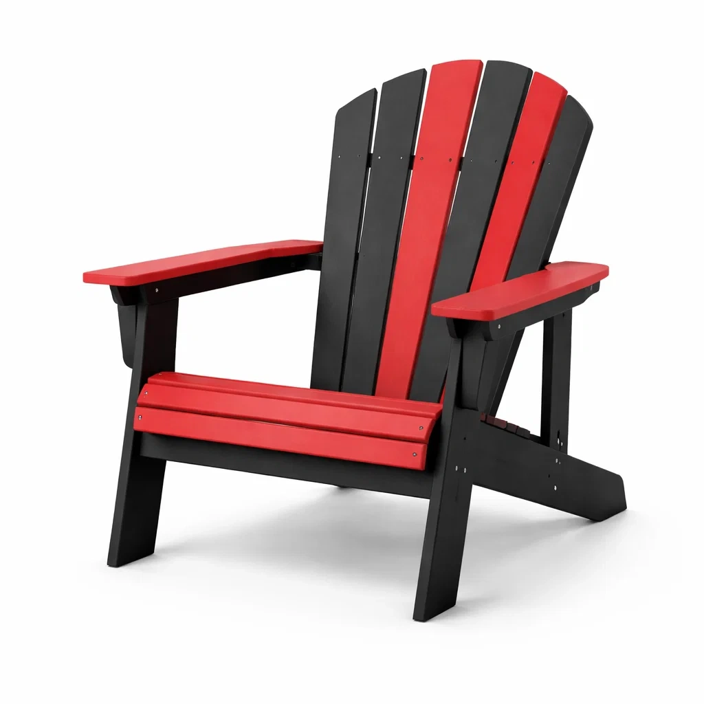 Chaise Adirondack fabriquée en bois composite. Couleurs Noir et Rouge. Dimensions : 90 cm de longueur, 75 cm de largeur et 89 cm de hauteur. Poids : 10 kg. Capacité de charge : 120 kg. Non réglable et non pliable. Nettoyer avec un chiffon humide.