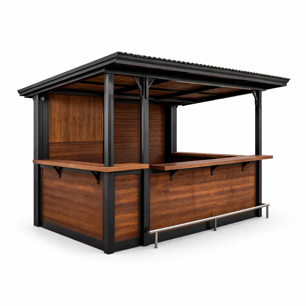 Ce kiosque de bar extérieur dispose d'un cadre en acier et de panneaux en bois traité avec une finition résistante aux intempéries. Dimensions : 200 cm de long, 150 cm de large et 220 cm de haut. Poids : 250 kg. Comprend un comptoir en bois, un toit et un repose-pieds métallique en acier inoxydable.